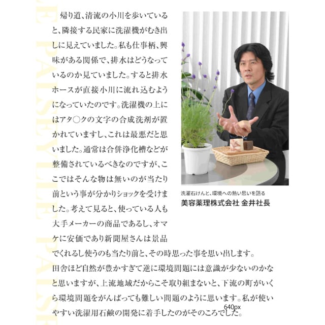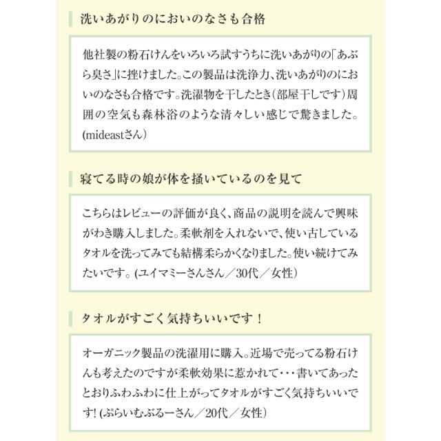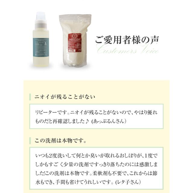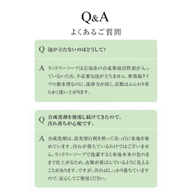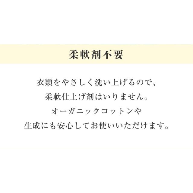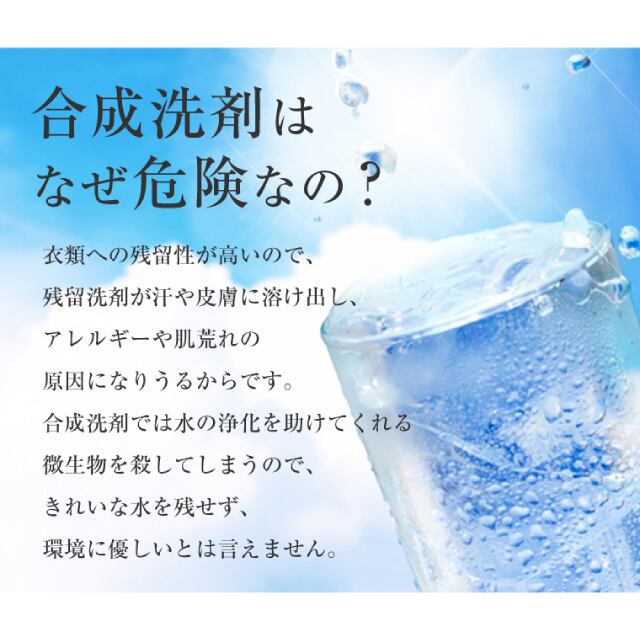 蛍光増白剤、水軟化剤、合成香料などを使用していないため、