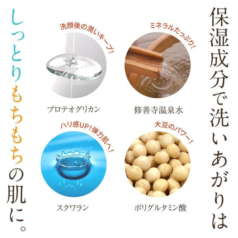 ・「水溶性プロテオグリカン」「修善寺温泉水」で洗顔後はつっぱらず、潤いをキープ。