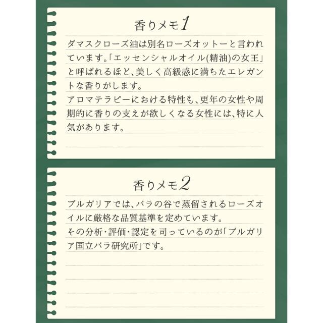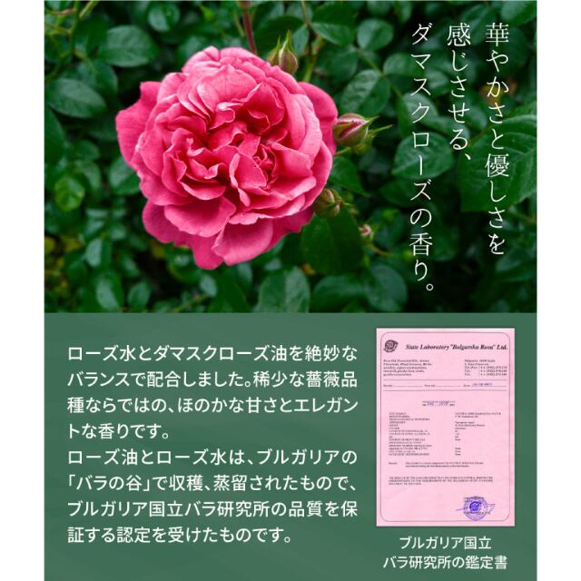 ● 華やかさと優しさを感じさせる、ダマスクローズの精油を配合。