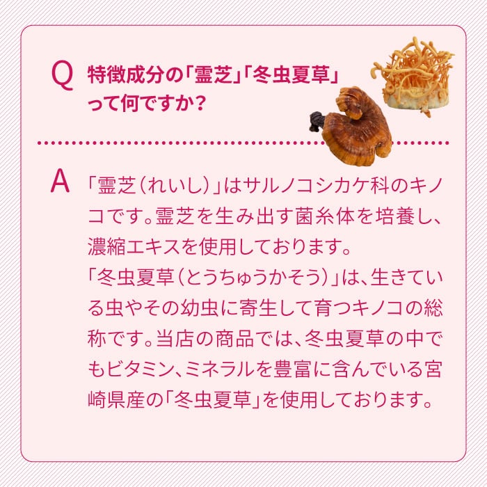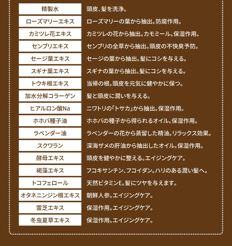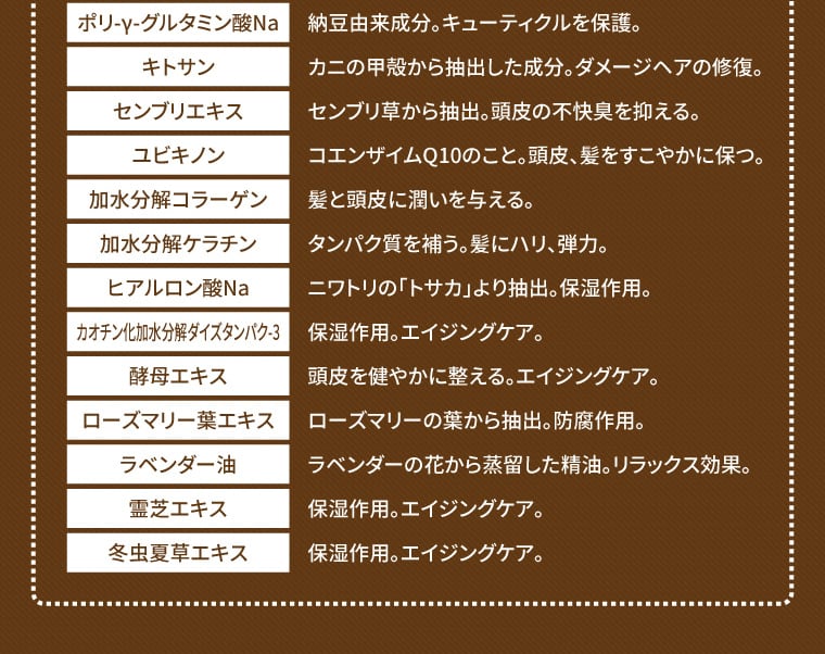霊芝・冬虫夏草をはじめ、髪にうるおいを与える保湿成分をタップリ配合。