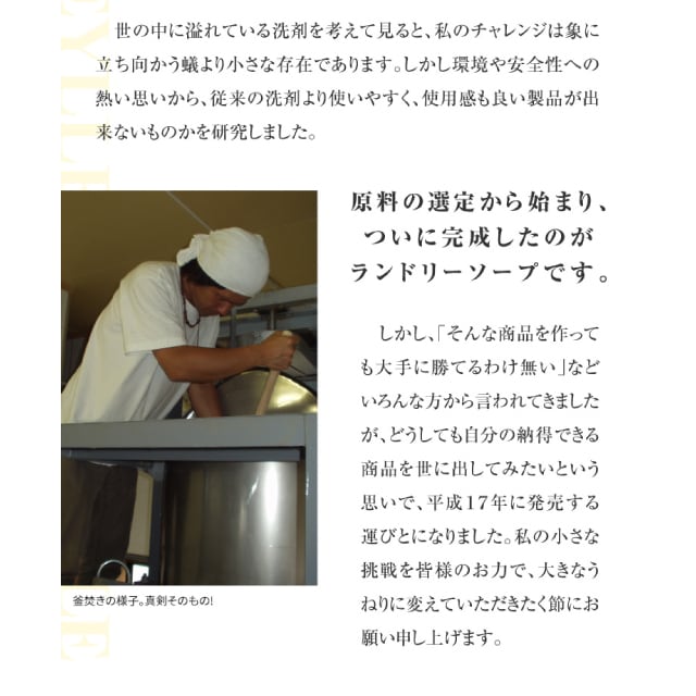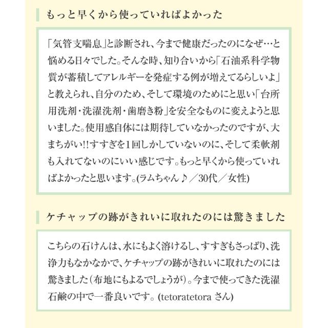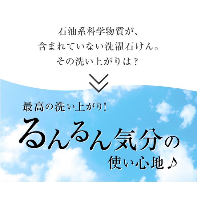 蛍光増白剤、水軟化剤、合成香料などを使用していないため、