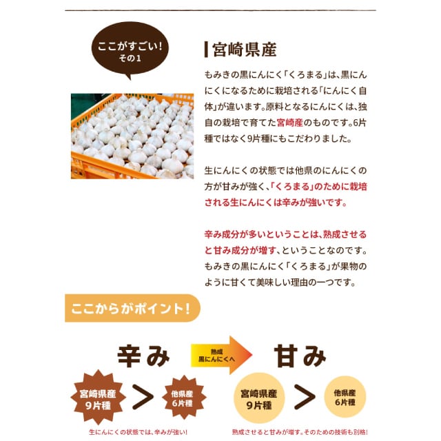 宮崎県の生産農家さんが丹誠込めて作った最高峰のにんにくを、 何もつけずに約3週間かけてじっくり熟成、 自然発酵させることで、にんにくの栄養分をさらに高めました。